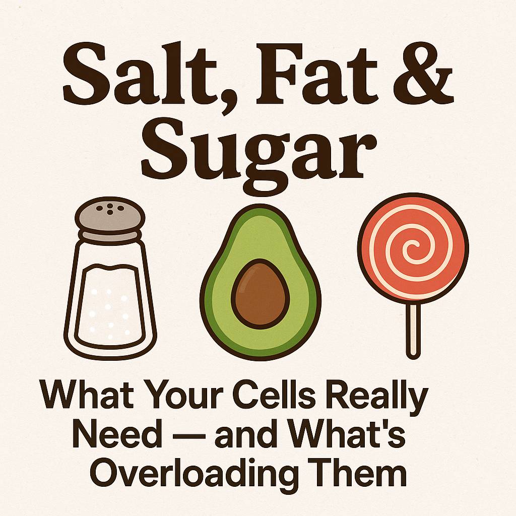 Salt, Fat & Sugar What Your Cells Really Need and What’s Overloading Them For decades, we’ve been told that fat and salt are the villains in our diets. “Low-fat” became synonymous with “healthy,” and “salt-free” was seen as heart-smart. Meanwhile, sugar — the sweet, innocent comfort in our coffee and cereal — quietly flooded into nearly everything we eat. But science is now revealing a different story. Salt and fat are essential nutrients, critical to our cells, our metabolism, and our...
